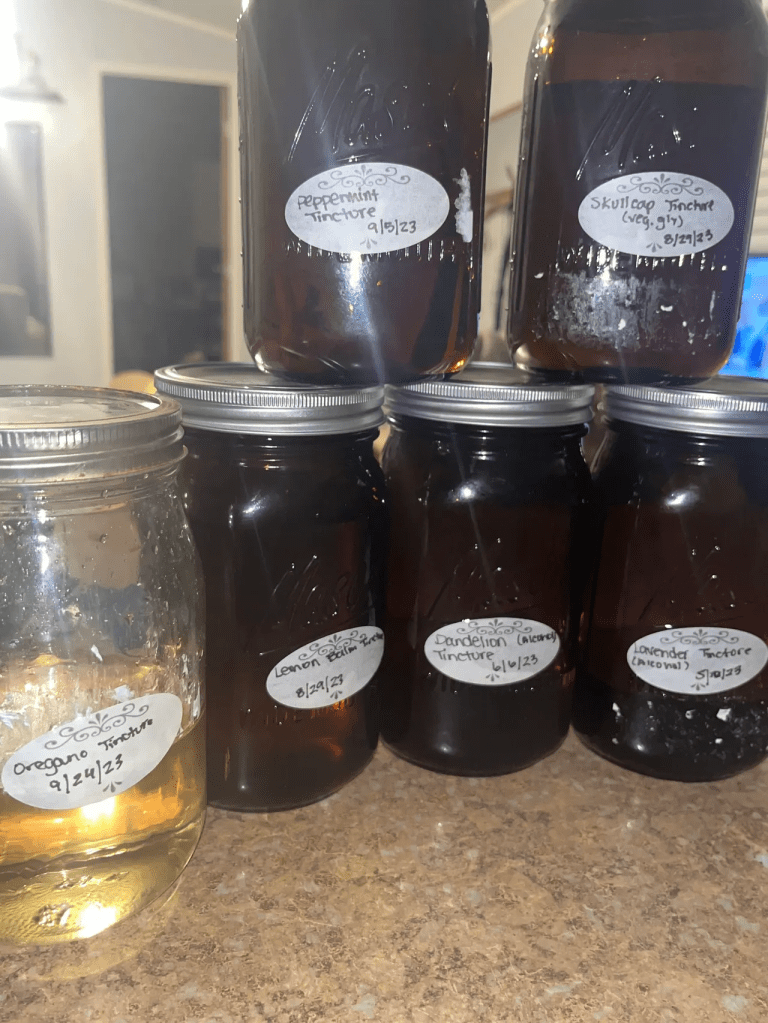 I followed a 1:5 ratio for dried herbs meaning 1 part herb and 5 parts alcohol or vegetable glycerin and 1:2 ratio for fresh herbs meaning 1 part herb and 2 parts alcohol or vegetable glycerin. This varied slightly depending on the size of my jar or amount of liquid I had to infuse the herbs, as well as the amount of harvested herbs.